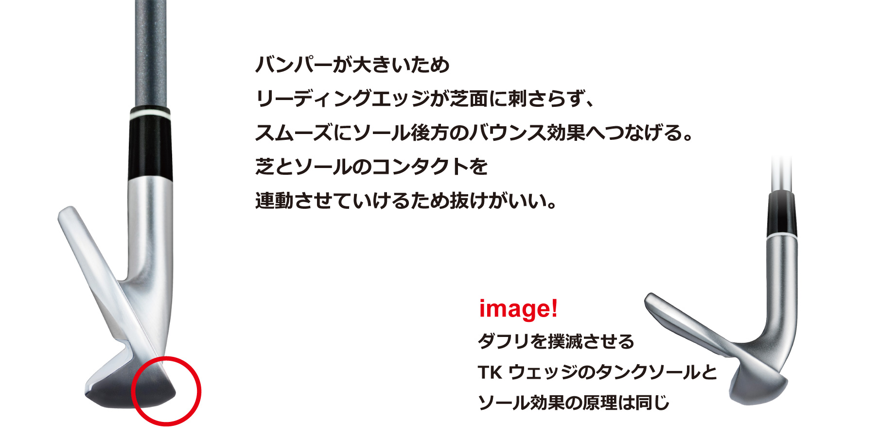 あらゆるヘッドの入射角に対して芝にヘッドを食い込ませず、後方のソール(バウンス効果)へと滑らせていき、ボールへしっかりヘッドをコンタクトできるのです。