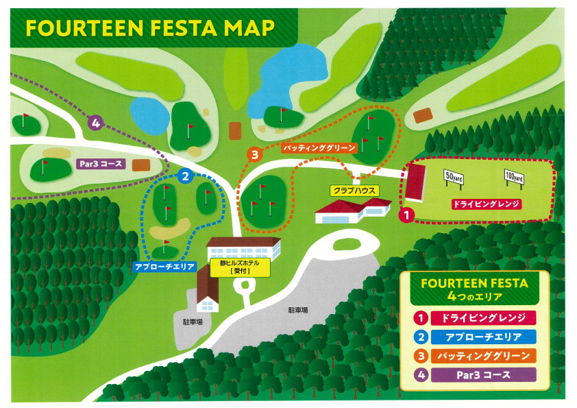 静ヒルズカントリークラブの練習施設のクオリティは関東屈指。280ヤードのレンジ、本格的なアプローチグリーンとパッティンググリーン、そして中嶋常幸プロが「オーガスタのPar3コースに匹敵する」と称したPar 3コースは当日回り放題。思う存分にFOURTEEN FESTAの1日を楽しんでいただけます。