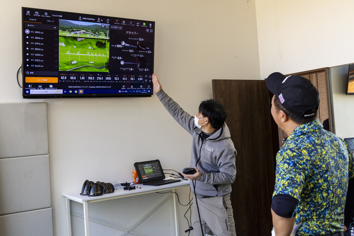 練習場では開発部の戸丸崇さんによる、「DXドライバー」のフィッティング会。参加者はモデル毎の性能差を実弾道とトラックマンデータから体感。