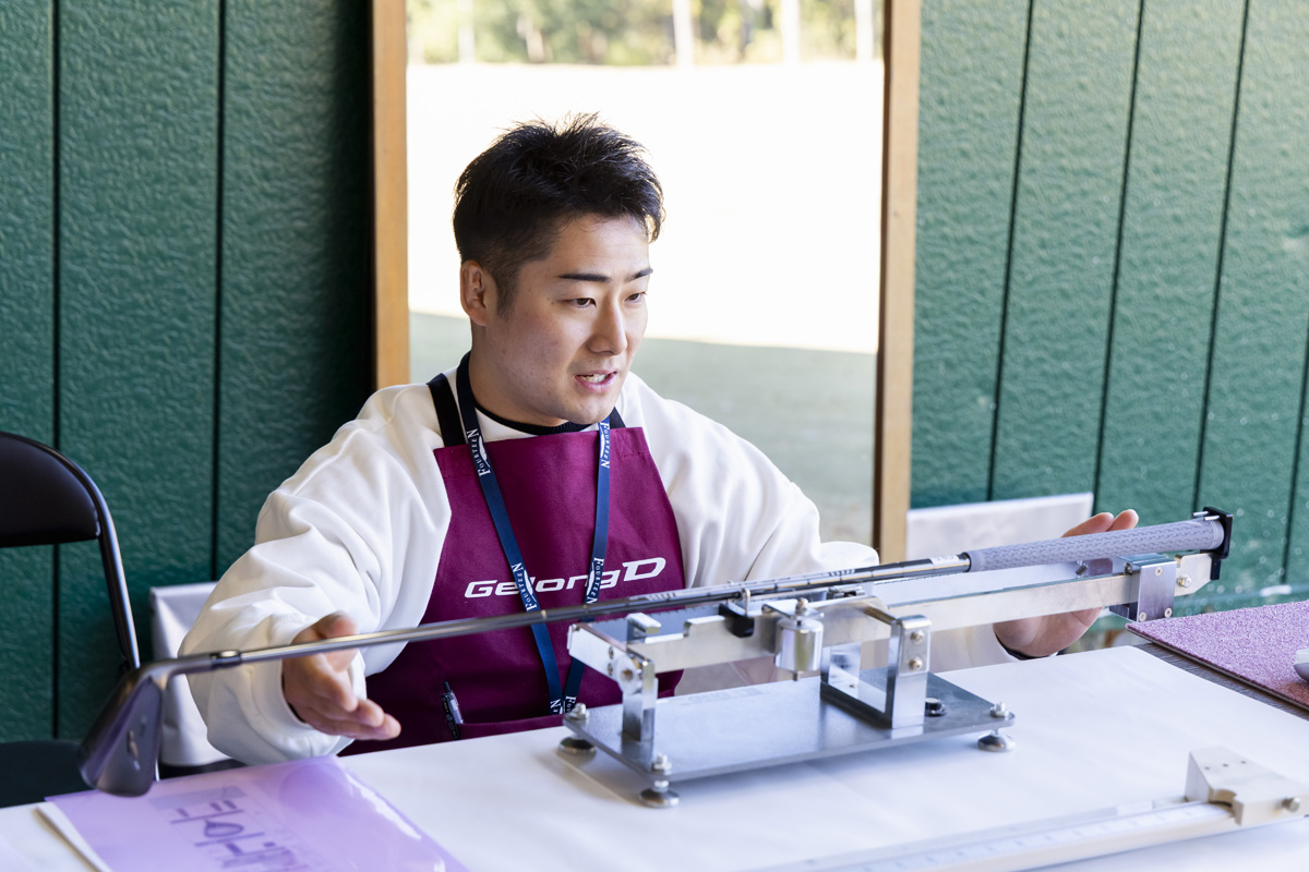 今イベントから新たな試みとなったのが、“クラブ診断”。クラブの長さ・重量・バランスなど、ご自分のクラブのスペックを可視化して、現在のショットパフォーマンスの課題が明らかになるかもあります。アマチュアゴルファーの傾向としては、ドライバーのヘッド重量が総じて重めで振り遅れていることが多い。軽量ヘッドの「DXドライバー」ならその振り遅れを改善できます。ちなみに世の中で一般的に使われているライロフトゲージはフォーティーンの開発で生まれた製品の一つ。
