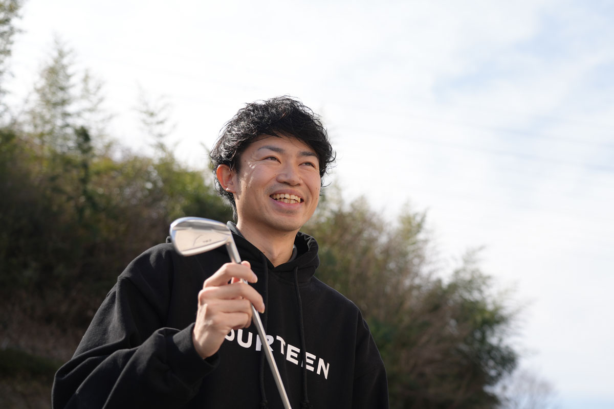 営業部・松本清斗。今日も昼休憩時の練習に励む彼は、フォーティーンで“ナンバーワンの向上心”の持ち主だ。2025年は日本スクランブルゴルフ選手権の選抜メンバーとして日本一に貢献。今年は2連覇に向けて、彼の向上心は尽きることがない。