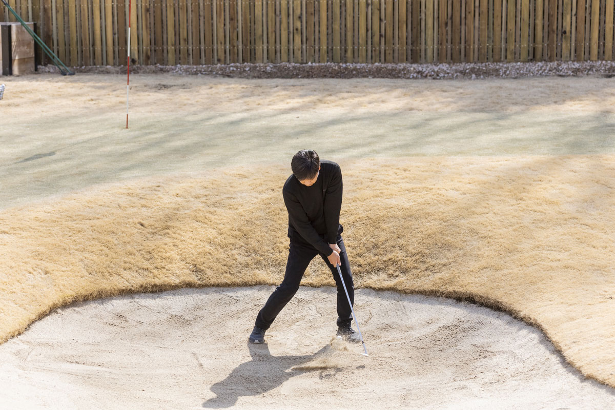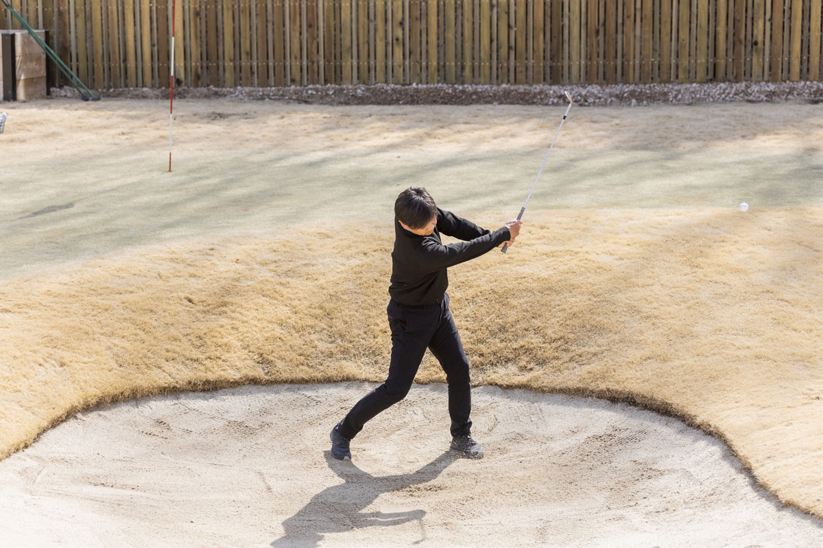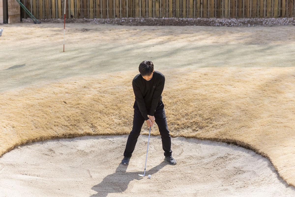 池田部長は「バンカーショットだからって特別なテクニックはいらない」というが、多くのアマチュアゴルファーにとっては、そのどれもが難解でテクニックが必要と感じる。とくにバンカーショットを苦手としている私にとって致命的ともいえる悩みはフェースを開くことができない(そんなゴルファーの皆さん、多いですよね)。そして何より一般アマチュアゴルファーはバンカーショットを日常的に練習できる環境にいないことも、それを難解にさせている理由の大きな原因。とにかくバンカーショットはやさしくない。